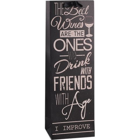 Dísztasak matt boros 12x36 cm Wine we drink 12 x 36 cm-es boros dísztasak anyag: 210 g/m2 súlyú papír formátum: álló felület: matt fogantyú: szalag