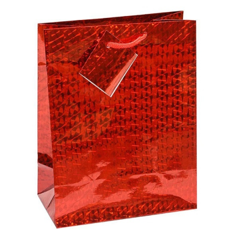 Papír ajándék tasak, hologrammos, Egyszínű piros sodort füles.