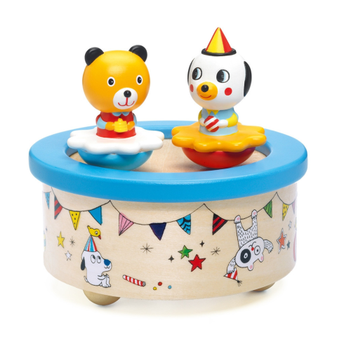 Mágneses zenedoboz körbe táncoló figurákkal. A két bájos babafigura Schubert Bölcsődalának dallamára forog a zenedoboz tetején. Zenére táncolnak, de önálló játékra is alkalmasak, ha éppen a kisgyermek babázni akar velük. A doboz mérete: 15,5 x 15,5 x 11