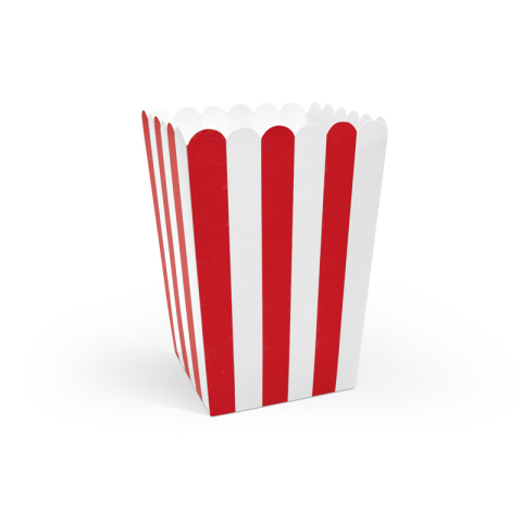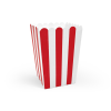 Popcorn dobozok piros színben fehér csíkokkal, mérete összeszerelés után kb. 7 x 7 x 12,5 cm. (1 db / 6 db.)