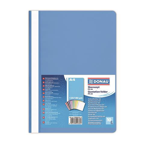 Gyorsfűző, PP, A4, DONAU, világoskék - A4 méretű dokumentumok tárolására - 200 lap lefűzésére alkalmas - 110 µ polipropilén áttetsző, narancsos fedlap és 180 µ polipropilén hátlap - feliratozható oldalcsík - 12 színváltozat Gyártó/első EU forgalmazó