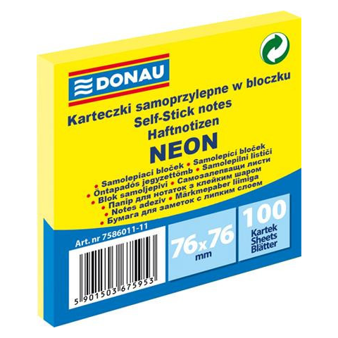 1 kép DONAU Öntapadó jegyzettömb, 76x76 mm, 100 lap, DONAU, neon sárga