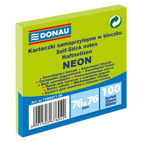 1 kép DONAU Öntapadó jegyzettömb, 76x76 mm, 100 lap, DONAU, neon zöld