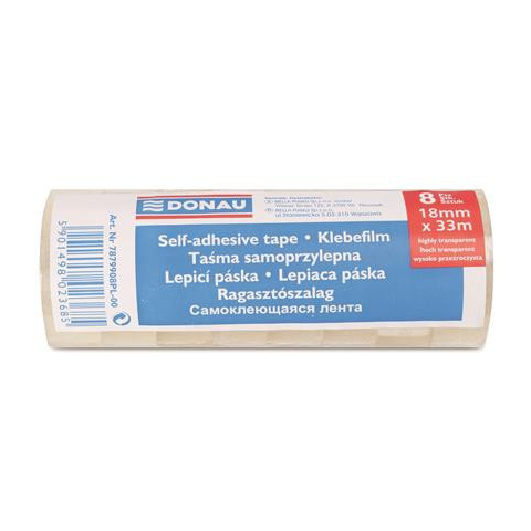 Ragasztószalag, 18 mm x 33 m, DONAU, átlátszó - elsárgulásmentes polipropilén - teljesen átlátszó - univerzális – irodába, iskolába és otthoni használatra egyaránt ajánlott - fénymásolaton, faxon nem látszik - nem írható Gyártó/első EU forgalmaz