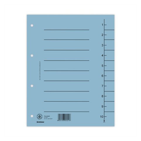 Regiszter, karton, A4, DONAU, kék - lefűzött dokumentumok kategorizálására - színes elválasztólapok - újrahasznosított, 250 g/m2 kartonból készült - 100 db/csomag - 4 lefűzőlyuk - méret: 235x300 mm Gyártó/első EU forgalmazó elérhetősége: PBS Connect P