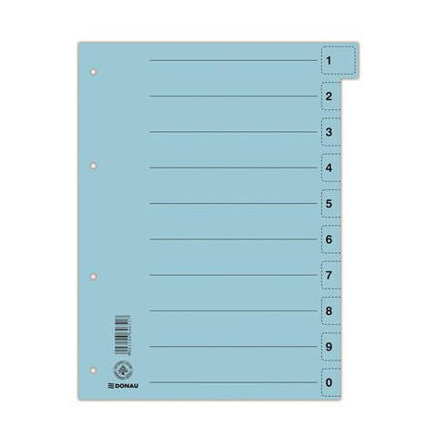 Regiszter, karton, A4, mikroperforált, DONAU, kék - lefűzött dokumentumok kategorizálására - színes - újrahasznosított, 250 g/m2 kartonból készült - mikroperforált fülek - 4 lefűzőlyuk - méret: 235x300 mm Gyártó/első EU forgalmazó elérhetősége: PBS Co