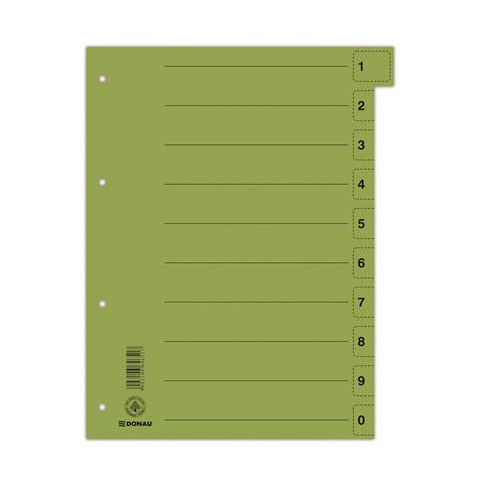 Regiszter, karton, A4, mikroperforált, DONAU, zöld - lefűzött dokumentumok kategorizálására - színes - újrahasznosított, 250 g/m2 kartonból készült - mikroperforált fülek - 4 lefűzőlyuk - méret: 235x300 mm Gyártó/első EU forgalmazó elérhetősége: PBS C