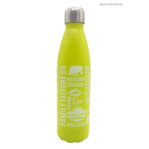 Rozsdamentes acélból készült termosz neonzöld alapon túra mintával, 500 ml DORAS saját gyártású, rozsdamentes acél termosza, rozsdamentes acél borítású műanyag kupakkal, festett neonzöld színben, fehér színű túra motívumokkal diszítve Mérete: 27 x 7,3