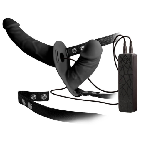 Tulajdonságok:-kényelmes, 3 pontos rögzítésű alsó-valódi bőr pántok-fém csattal állítható pántméret (78-108cm között)-dupla péniszes kialakítás-élethű forma-kellemes tapintás-formás makk-vezetékes távirányító-egyszerű,