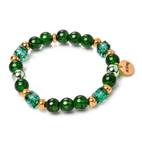 RUGALMAS KARKÖTŐ, a mérete választható.Az ékszer ásványai és tartozékai:– 8 mm-es zöld hematit gyöngyök– 8 mm-es zöld roppantott hegyikristály gyöngyök– 8 mm-es zöld üvegkocka gyöngyök– Arany színű fémdíszek– M.King má
