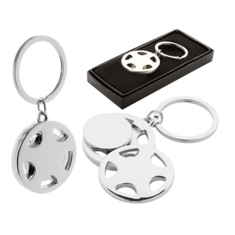 Autókerék alakú, fém kulcstartó, bevásárlókocsi érmével, fekete díszdobozban szállítjuk.