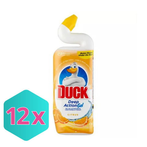 A Duck kacsa egy hatékony fertőtlenítő WC-tisztító gél, melynek citrus illata frissességet kölcsönöz. Tulajdonságok: Hatékony fertőtlenítés: A Duck Deep Action megöli a baktériumok 99,9%-át. Különleges, ívelt nyakának köszönhetően a perem alatti rész is