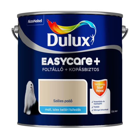 A Dulux Easycare+ foltálló, kopásbiztos falfesték a mechanikai hatásoknak kivételesen ellenálló tuladonságú, matt, latex, beltéri falfesték. A termék a kopásbiztos technológiának köszönhetően különlegesen tartós és szilárd bevonatot alkot, amelyen mérsékelten alakulnak ki szennyeződés-, dörzsölés-, és kopásnyomok. A fa, műanyag vagy gumi tárgyak (bútorok,porszívó, kerékpár stb.) okozta karcolások és horzsolások kevésbé károsítják a falfelületet, a
