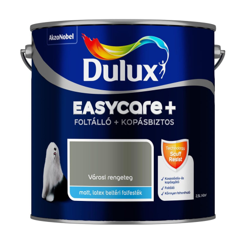A Dulux Easycare+ foltálló, kopásbiztos falfesték a mechanikai hatásoknak kivételesen ellenálló tuladonságú, matt, latex, beltéri falfesték. A termék a kopásbiztos technológiának köszönhetően különlegesen tartós és szilárd bevonatot alkot, amelyen mérsékelten alakulnak ki szennyeződés-, dörzsölés-, és kopásnyomok. A fa, műanyag vagy gumi tárgyak (bútorok,porszívó, kerékpár stb.) okozta karcolások és horzsolások kevésbé károsítják a falfelületet, a