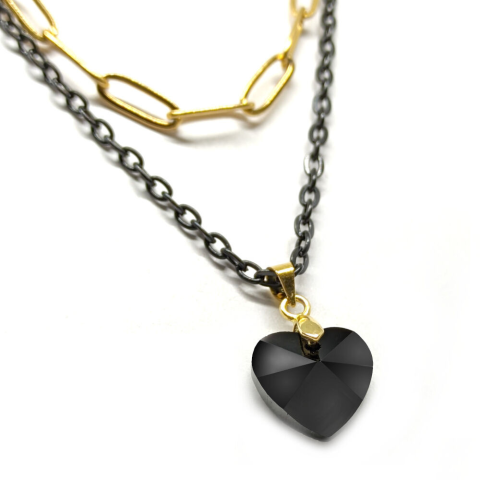 1 kép Dupla rozsdamentes acél nyaklánc arany-fekete színben, fekete kristály szív medállal