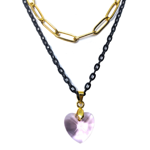 1 kép Dupla rozsdamentes acél nyaklánc arany-fekete színben, rózsaszín kristály szív medállal