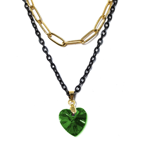 1 kép Dupla rozsdamentes acél nyaklánc arany-fekete színben, zöld kristály szív medállal