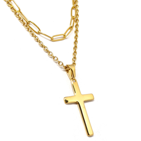 1 kép Dupla rozsdamentes acél nyaklánc arany színben, nemesacél kereszt medállal II.