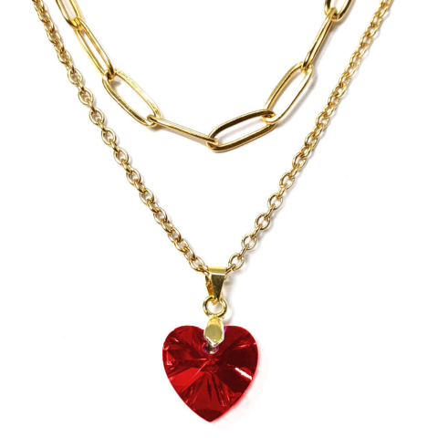 1 kép Dupla rozsdamentes acél nyaklánc arany színben, piros kristály szív medállal