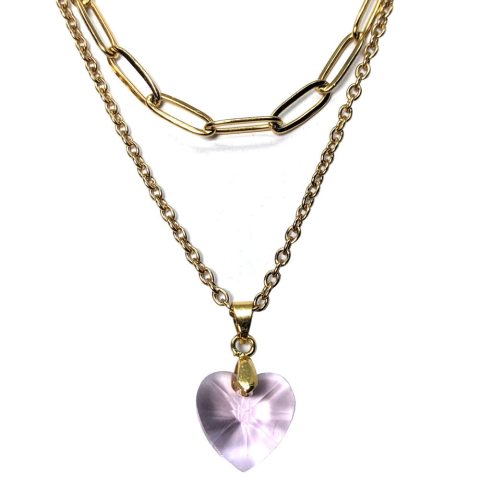 1 kép Dupla rozsdamentes acél nyaklánc arany színben, rózsaszín kristály szív medállal