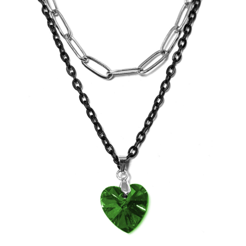 1 kép Dupla rozsdamentes acél nyaklánc ezüst-fekete színben, zöld kristály szív medállal