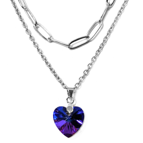 1 kép Dupla rozsdamentes acél nyaklánc ezüst színben, kék kristály szív medállal