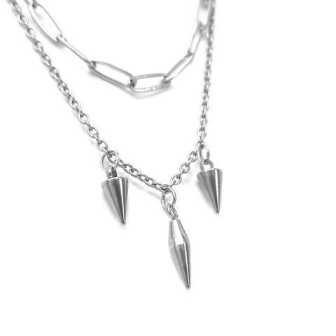 1 kép Dupla rozsdamentes acél nyaklánc ezüst színben, kúp szegecs charmokkal