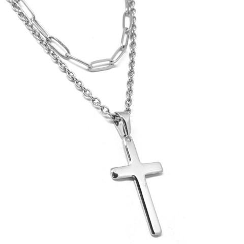 1 kép Dupla rozsdamentes acél nyaklánc ezüst színben, nemesacél kereszt medállal II.
