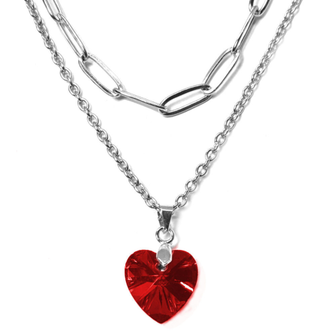 1 kép Dupla rozsdamentes acél nyaklánc ezüst színben, piros kristály szív medállal