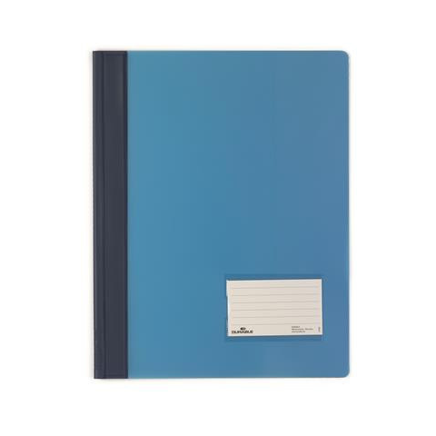 Gyorsfűző, A4, extra erős, széles, DURABLE, kék Elegáns, áttetsző PVC gyorsfűző színes előlappal és hátlappal. -alkalmas a lyukasztott tasakok fűzésére az extra széles A4 formátumnak köszönhetően -rendkívül strapabíró, szakadásálló lefűzőszerkezet