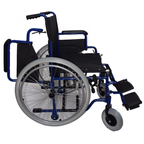 Eagle II összecsukható kerekesszék 120 kg-ig - kék színű, összecsukható váz, - mindegyik méretben dupla acél keresztpánttal (rendkívüli stabilitást biztosít), - derék rögzítését szolgáló biztonsági övvel, - 24 gyorskioldású hátsó kerék PU/tömör gumiabr