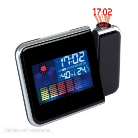 Colour ébresztőóra kivetítővel piros fényű kivetítővel, időjárás előrejelzéssel, ébresztő órával, dátum és óra kijelzéssel, hygro/thermométerrel (°C és °F), érintésre kivilágosodó színes LCD kijelzővel, fekete háttérrel, hátulján kihajtható támasszal M