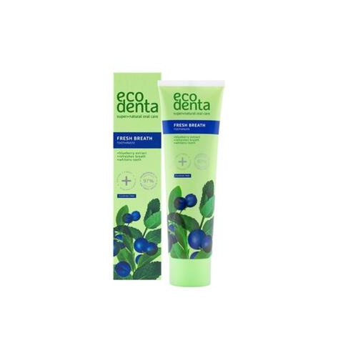 Az Ecodenta Fogkrém a friss leheletért áfonyával és mentával hatékonyan távolítja el a lepedéket és támogatja a fogak fehérségét. Az áfonya természetes védelmet nyújt az íny számára, a menta frissíti a leheletet, miközben a