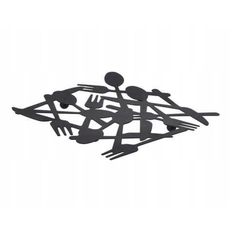 PRAKTIKUS - Praktikus állvány meleg edényekhez evőeszköz motívummal. SZILÁRD - Matt fekete fémből készült. DIVATOS DIZÁJN - Az egész alátétet alkotó evőeszközök egyedi dizájnja és motívuma gyönyörűen fog mutatni a konyhában és az étkezőben. VÉDŐ - Az állv