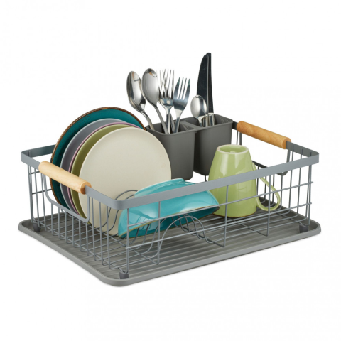Mosogatótálca csepptálcával és evőeszközkosárral Ez a praktikus mosogatótálca nem csak az optimális és egyszerű szárítást segíti elő, hanem matt kialakításának és fa fogantyúinak köszönhetően elegáns megjelenést is biztosít. A lecsepegtetett víz a műanyag