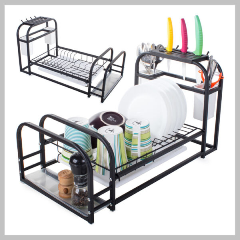 Edényszárító tálca állvánnyal 07131A konyhai szárítógép kiváló minőségű porszórt fémből készült. Ellenáll a sérüléseknek és a nedves edények tárolásából származó nedvesség hatásainak.A stabil konstrukció kényelmes nagy vályútalppal gondoskodik arról, hogy a víz ne csöpögjön a munkalapra és ne károsítsa a bútorokat. Az állítható műanyag lábak lehetővé teszik a szárítógép vízszintbe állítását.A szárítógép modern loft stílusú kia