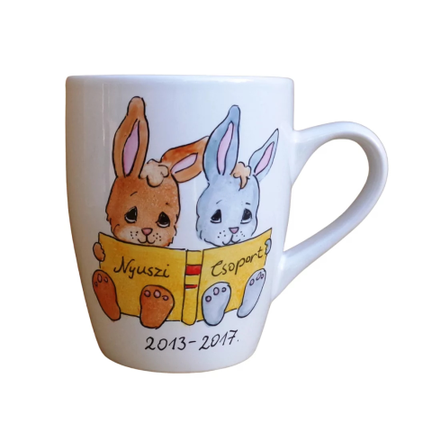 Egyedi bögre ballagásra3 dl-es bögre, melyre az általatok kért mintát festem meg küldött kép vagy leírás alapján. Ez lehet a csoport jele, a gyerekek jele és neve (max 10), az óvónő/tanárnő alakja stb. plusz egy rövid köszöntő szöveg. Mikrózható, mosogatógépbe betehető.