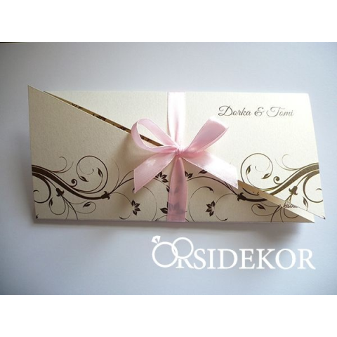 Ha stílusosan szeretnétek meghívni vendégeiteket, kiváló választás ez klasszikus, de mégis elegáns, szalaggal díszített, indamintás esküvői meghívó. A szalaggal igyekeztünk még egyedibbé tenni számotokra, melynek színe választható. A meghívó kinyithat