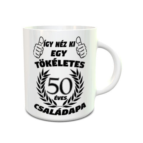 Egyedi szülinapi bögre, tökéletes családapa. Születésnapi bögre apának, Így néz ki egy tökéletes családapa felirattal, életkorral. Választható kerámia, víztiszta üveg vagy zománc bögre. Rendelj mellé díszdobozt is! Egyedi nyomtatású bögréink kiváló vál