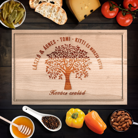 Egyedi vágódeszka családfa nevekkel konyhai eszköz árgrafikon