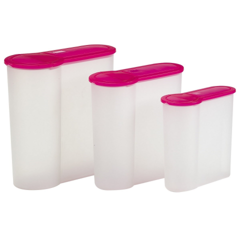 A három műanyag tárolódobozból álló készlet alkalmas a szemcsés élelmiszerek tárolására. A dobozok praktikus műanyag fedéllel vannak ellátva, amelyhez csuklós fedél is tartozik. A készletben mindig három különböző méretű doboz van. Többféle színváltozatban kínáljuk, választás lehetősége nélkül. A dobozok méretei: nagy tárolódoboz: 25,2 x 25,2 x 11,2 cm, térfogat: 4 lközepes tárolódoboz: 21,5 x 21,8 x 9,6 cm, térfogat: 2,4 lkis tárolódoboz 18 x