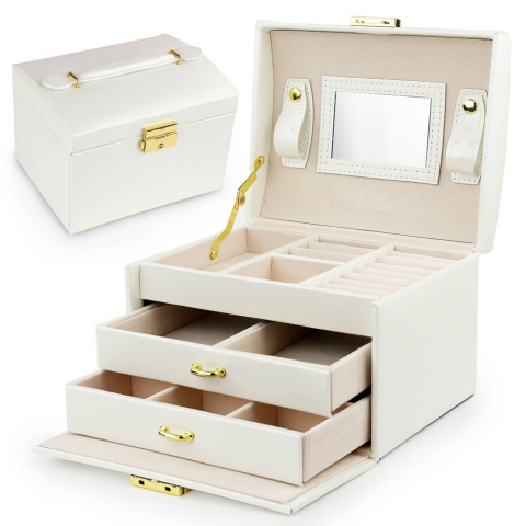 Ékszerek és egyéb kiegészítők tárolására alkalmas doboz. A fogantyúnak köszönhetően könnyen hordozható. Anyaga műbőr. Méretei: 175x140x130 mm.