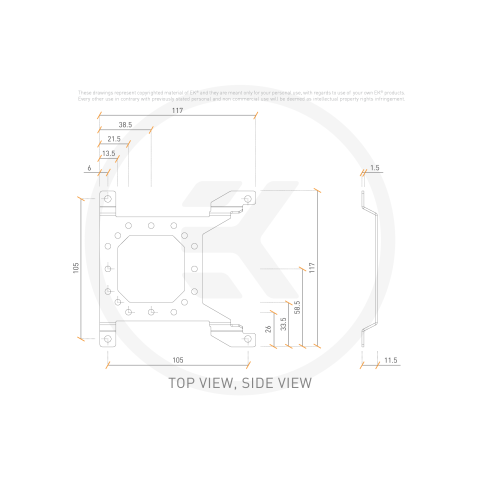 EK-Loop UNI szivattyútartály-tartó - 120 mm-es szerelőadapter az EK D5, DDC, SPC és VTX szivattyúk és szivattyú-tartály kombó egységek felszereléséhez bármilyen 120 mm-es ventilátorra szerelt furatmintához (105 mm-es lyukasztással). Ezenkívül az EK-RES X3 60 mm-es tartóval (2 db) használható bármilyen tartály vagy szivattyú-tartály kombináció felszerelésére egy 60 mm átmérőjű csővel.