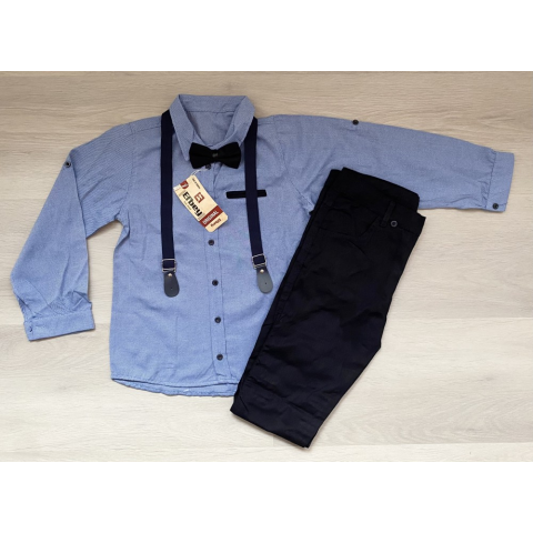 Elegáns négy részes fiú alkalmi / ünneplő szett csokornyakkendővel és levehető nadrágtartóval. Az ing jácintkék színű, ujja felhajtható, nadrágja egy hozzáillő fekete színű, állítható derékkal. Ideális választás ünnepi alkalmakra vagy akár fotózásra egyar