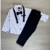 Elegáns fiú alkalmi szett csokornyakkendővel és levehető nadrágtartóval. Az ing fehér színű és apró sötétkék mintás, ujja felhajtható, nadrágja egy hozzáillő sötétkék színű és állítható derekú. Ideális választás ünnepi alkalmakra vagy akár fotózásra is.