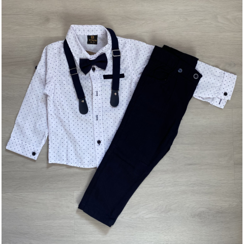 Elegáns fiú alkalmi szett csokornyakkendővel és levehető nadrágtartóval. Az ing fehér színű és apró sötétkék mintás, ujja felhajtható, nadrágja egy hozzáillő sötétkék színű és állítható derekú. Ideális választás ünnepi alkalmakra vagy akár fotózásra is.