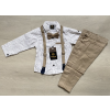 Elegáns fiú alkalmi szett csokornyakkendővel és levehető nadrágtartóval. Az ing fehér színű és apró mintás, ujja felhajtható, nadrágja egy hozzáillő bézs színű és állítható derekú. Ideális választás ünnepi alkalmakra vagy akár fotózásra egyaránt. Ing tel