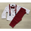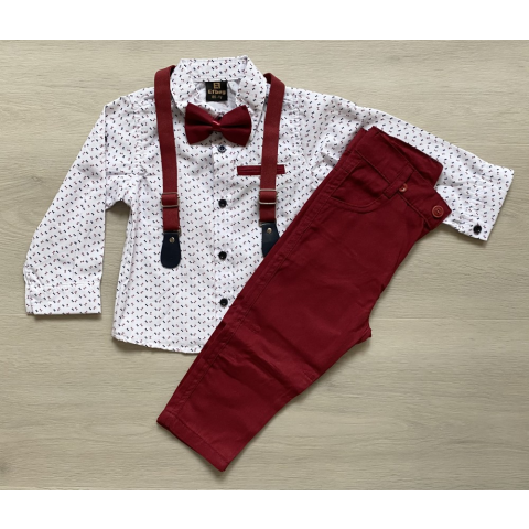 Elegáns fiú alkalmi szett csokornyakkendővel és levehető nadrágtartóval. Az ing fehér színű és apró bordó, sötétkék mintás, ujja felhajtható, nadrágja egy hozzáillő bordó színű és állítható derekú. Ideális választás ünnepi alkalmakra vagy akár fotózásra i