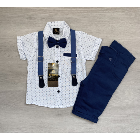 Elegáns négy részes fiú alkalmi / ünneplő szett csokornyakkendővel és levehető nadrágtartóval. Az ing fehér színű apró királykék színű mintával, nadrágja királykék színű és állítható gumírozott derekú. Az ing ujja és a nadrág hossza rövid. Ideális válasz