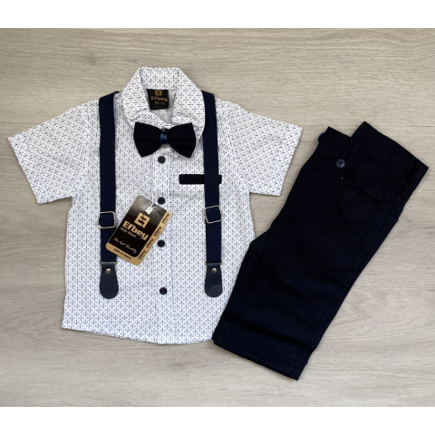 Elegáns négy részes fiú alkalmi / ünneplő szett csokornyakkendővel és levehető nadrágtartóval. Az ing fehér színű apró sötétkék színű mintával, nadrágja sötétkék színű és állítható gumírozott derekú. Az ing ujja és a nadrág hossza rövid. Ideális választá